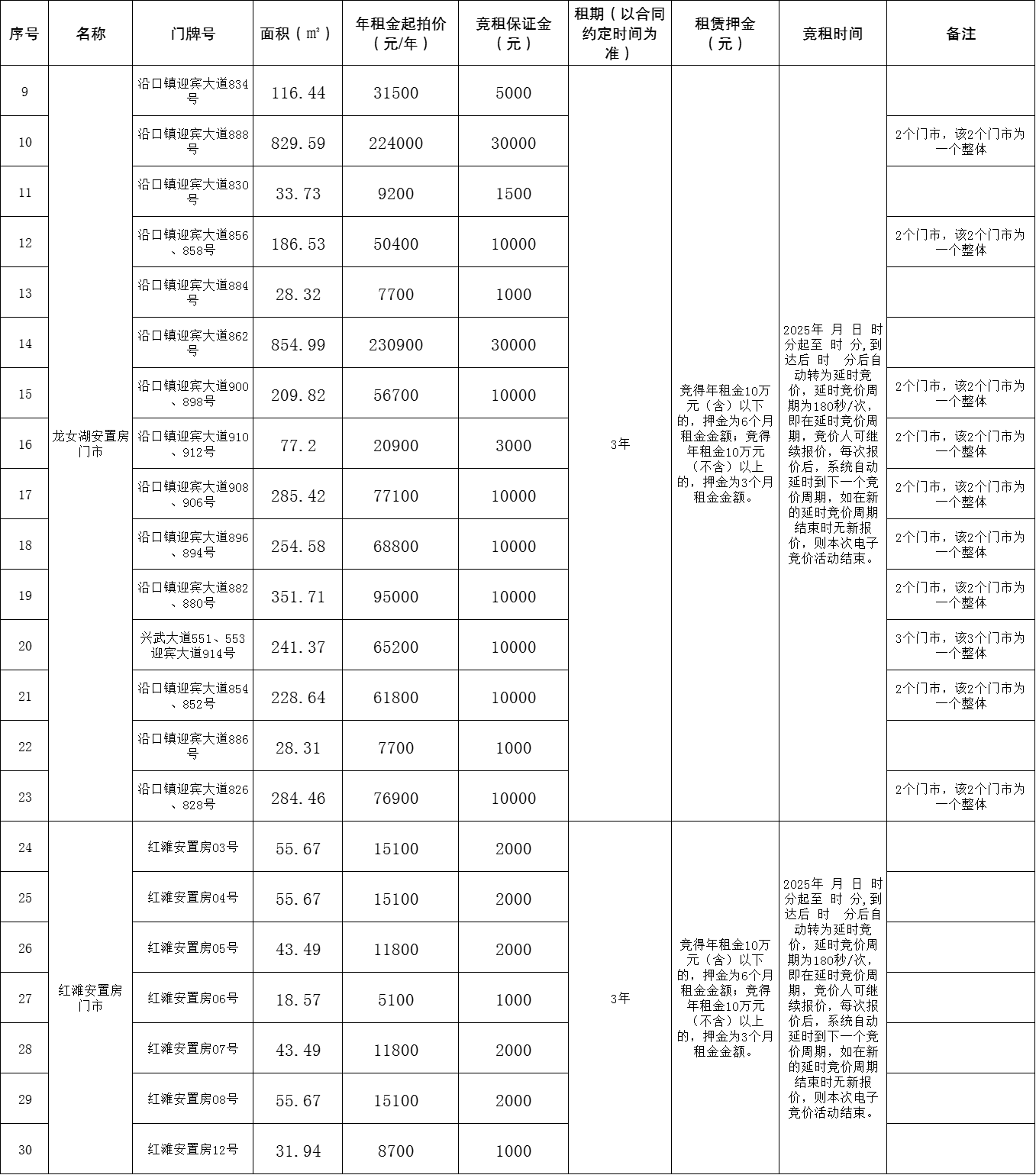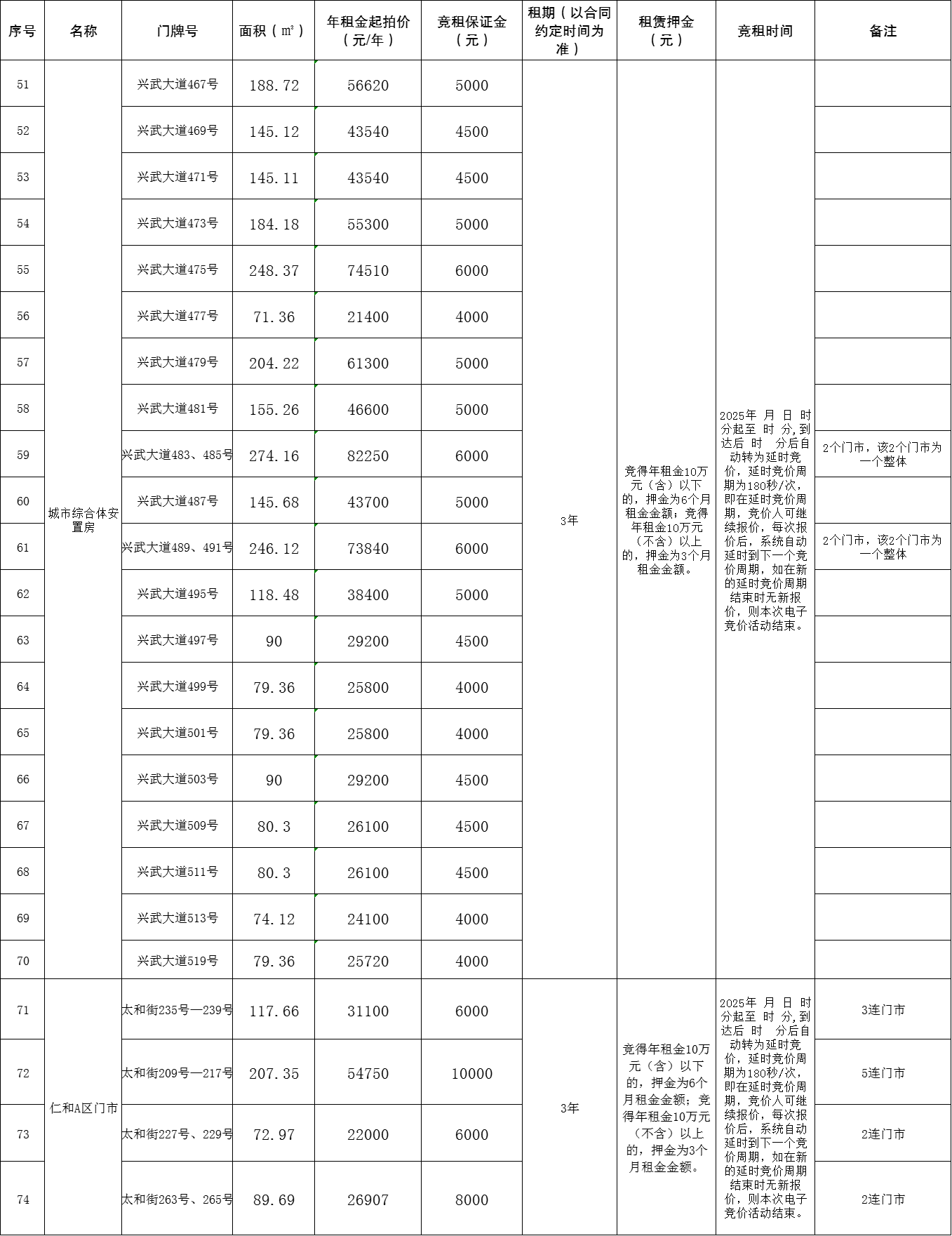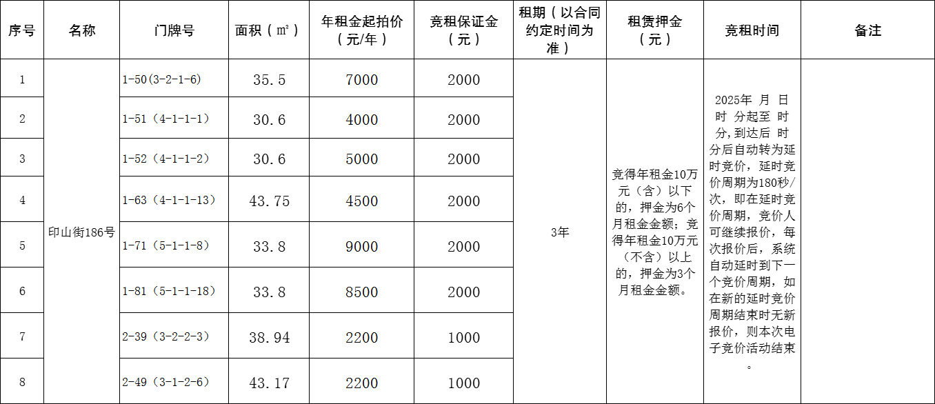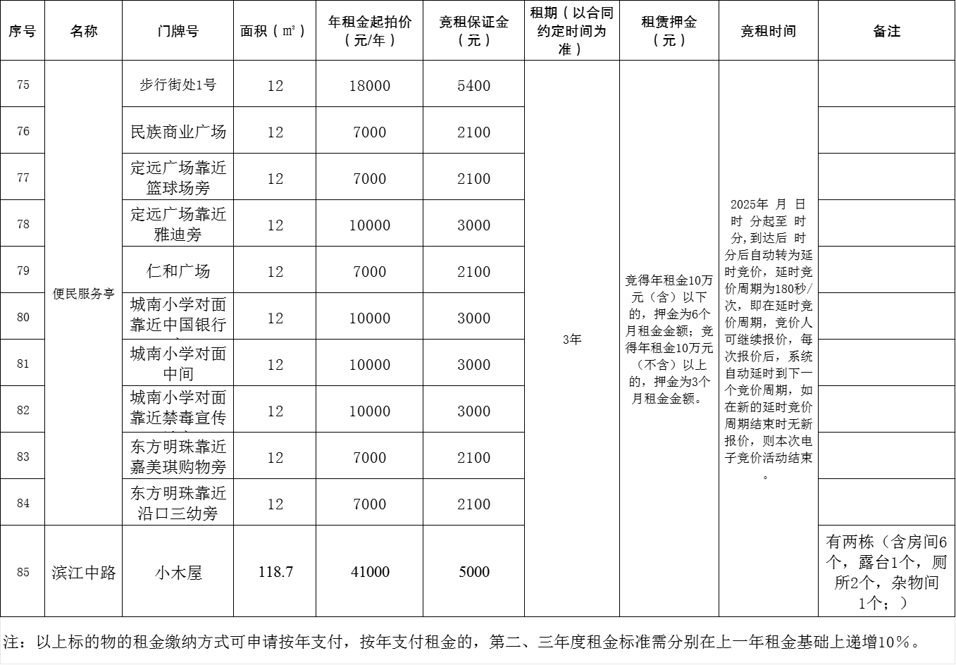 注:以上标的物的租金缴纳方式可申请按年支付,按年支付租金的,第二、三年度租金标准需分别在上一年租金基础上递增10%。